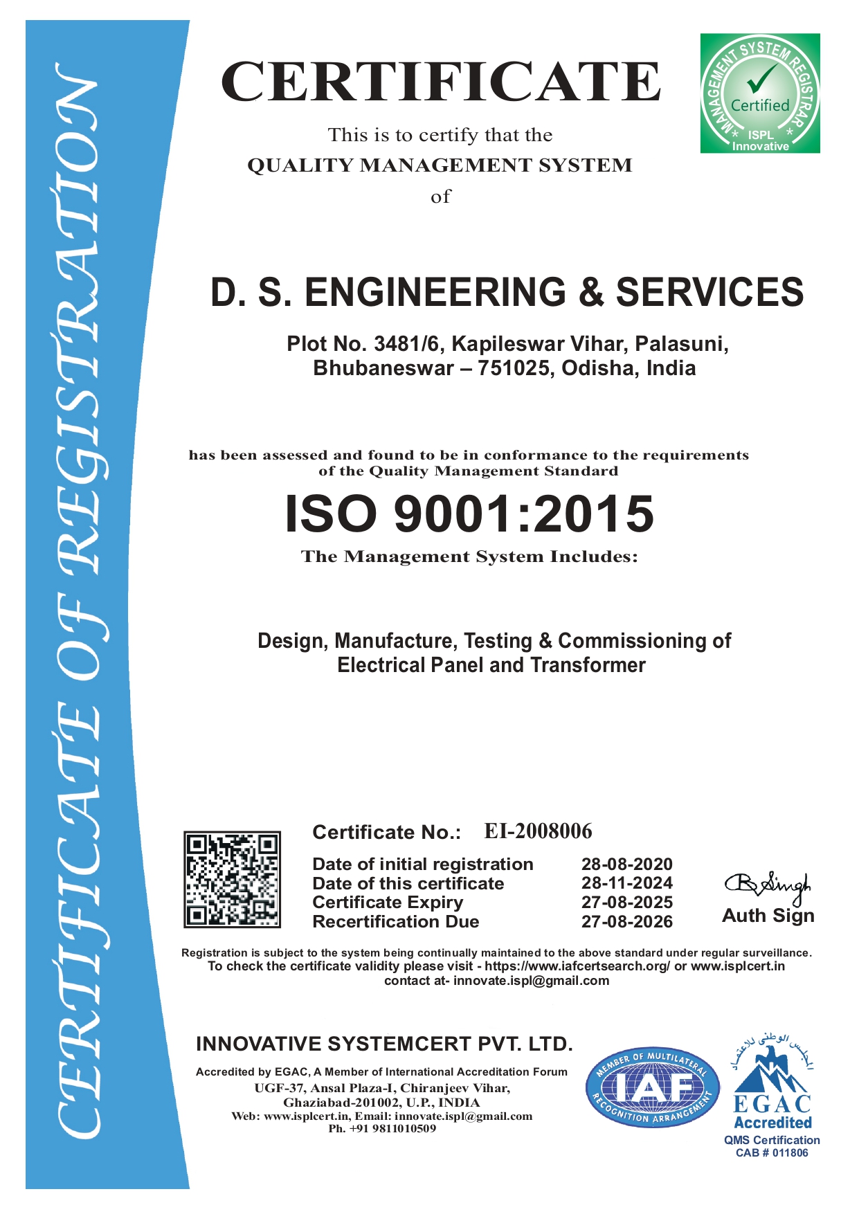 DS Engineering & Services is proud to be an ISO 9001:2015 certified organization. We prioritize quality production across our electrical control panel range, ensuring compliance with international standards.